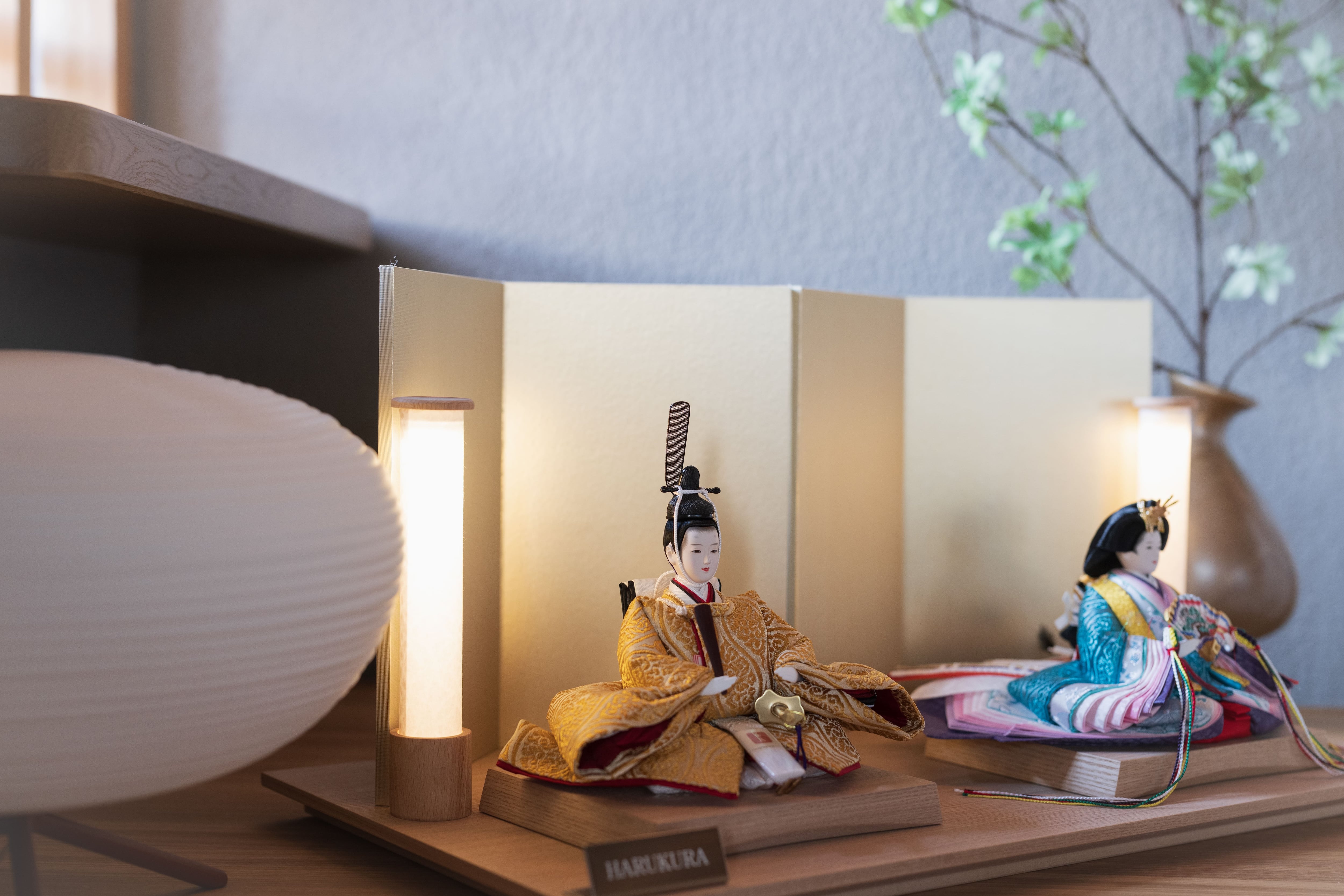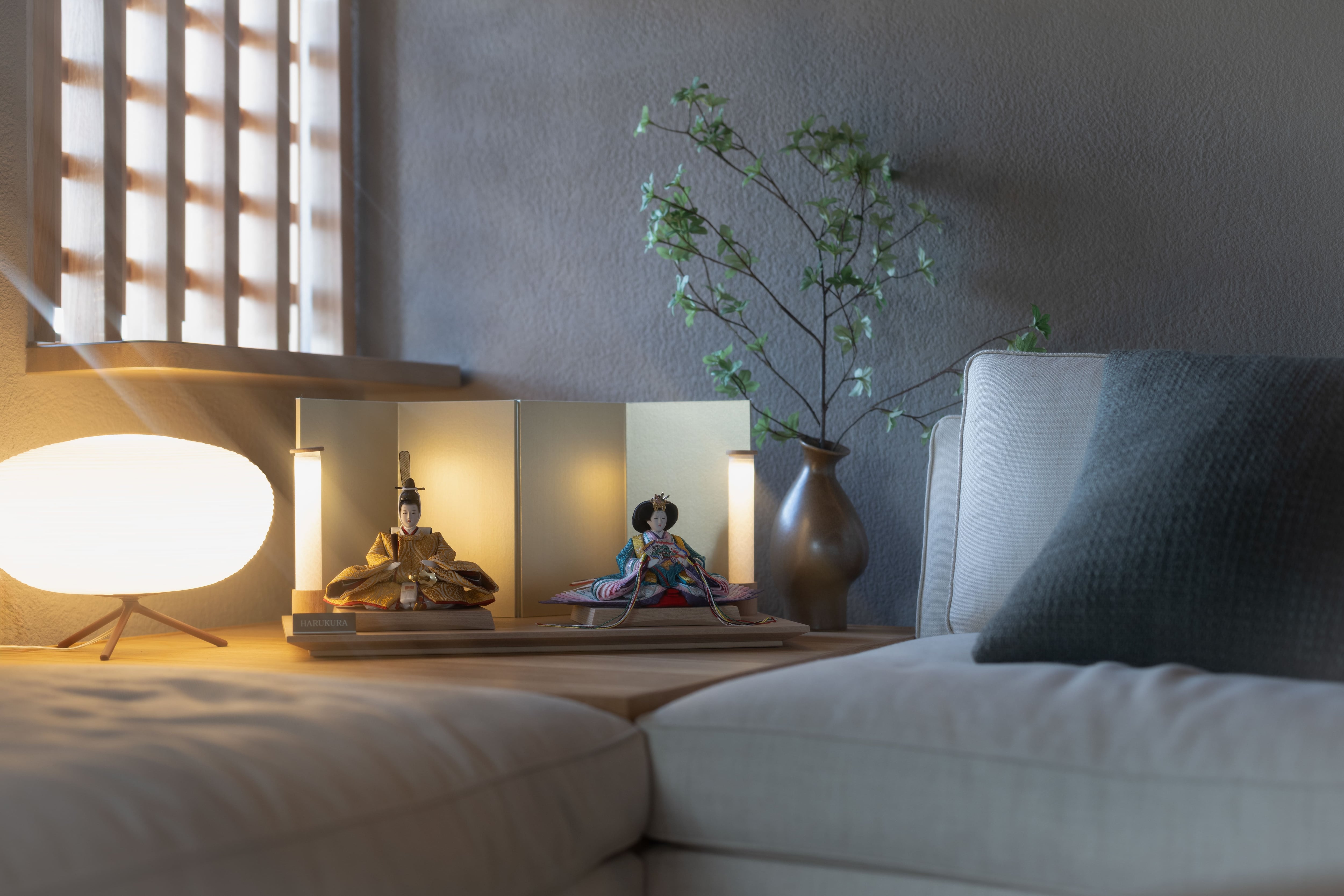 シンプルなパール色の台屏風セットに飾るとお雛様の輝きが一際目立ちます。