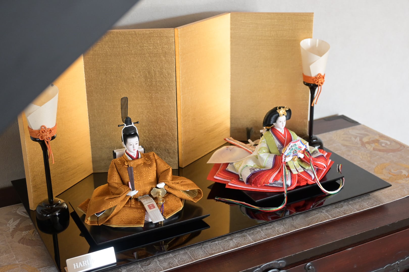お殿様は高貴な「黄櫨染(こうろぜん)」の御袍(ごほう)を、お姫様は緑や朱を重ねた雅やかな十二単をまとい、日本の伝統美を気品高く表現しています。