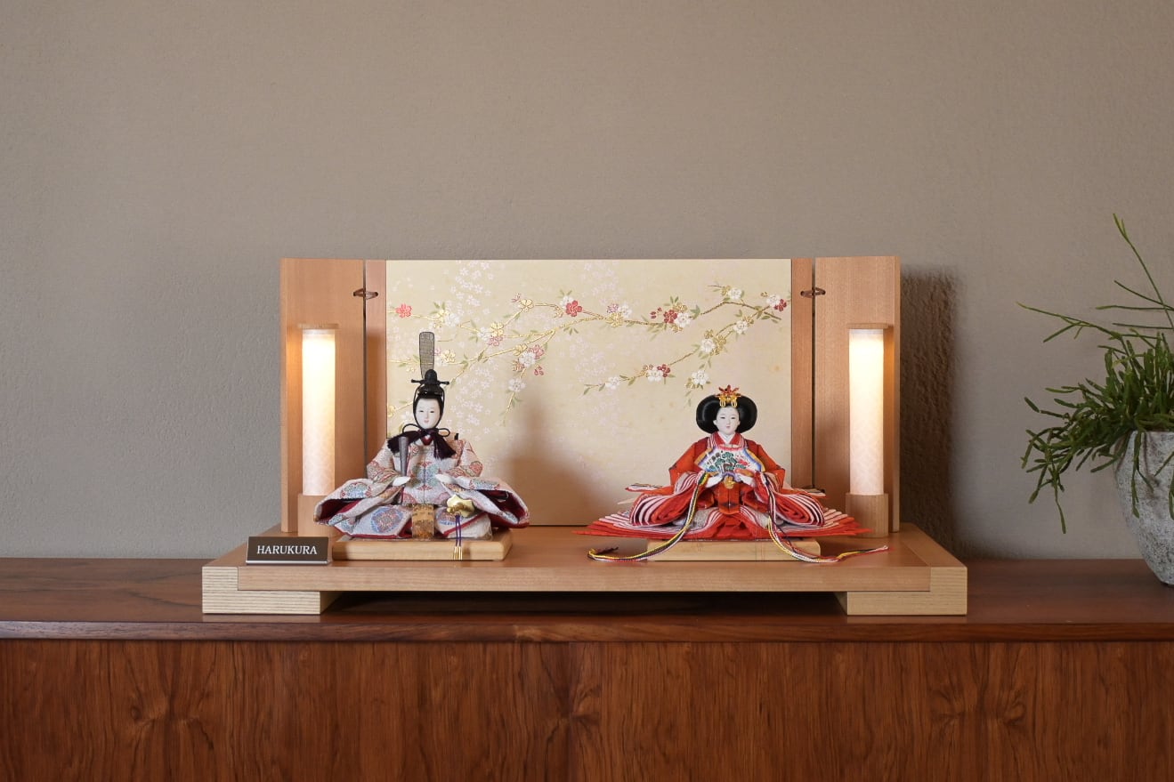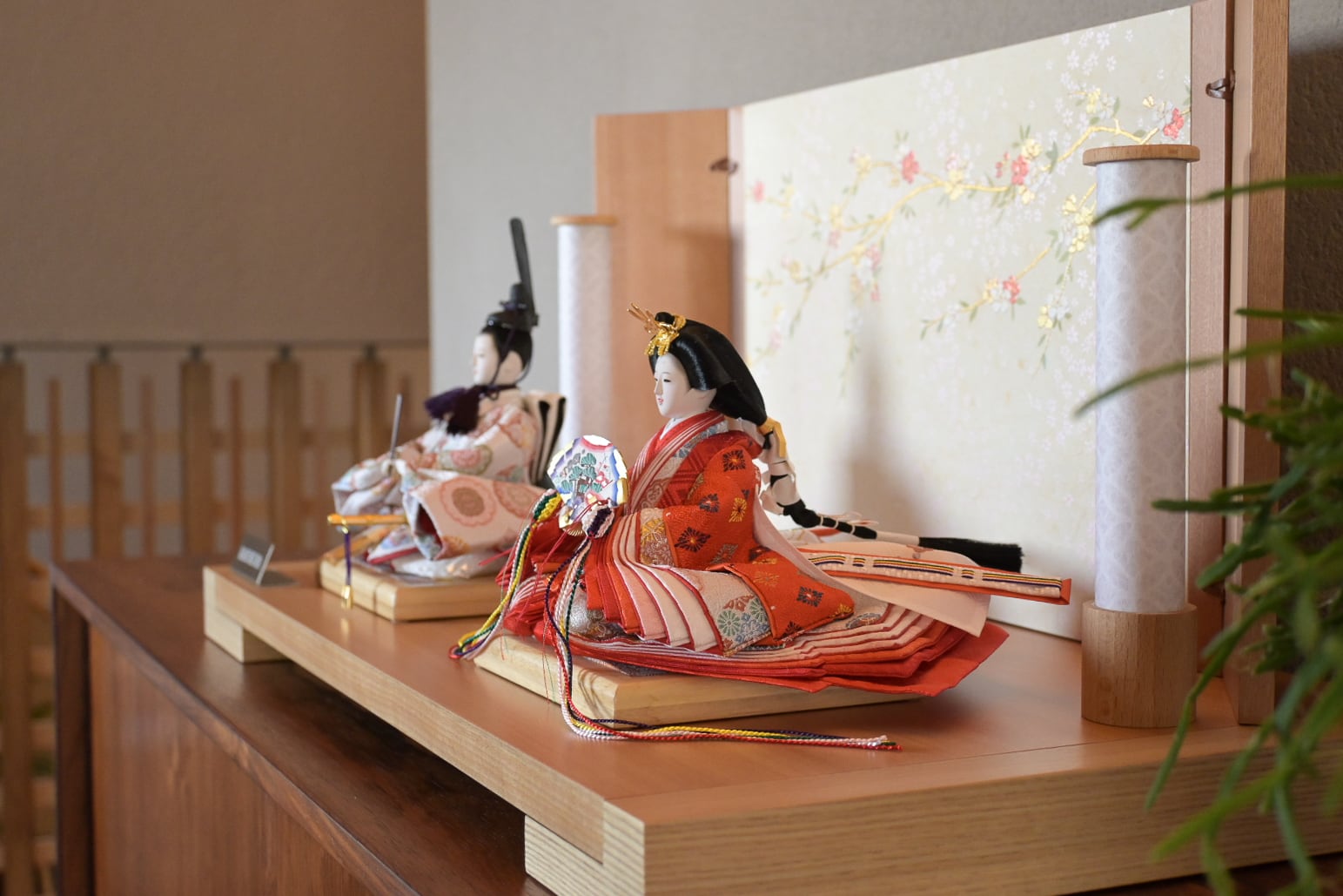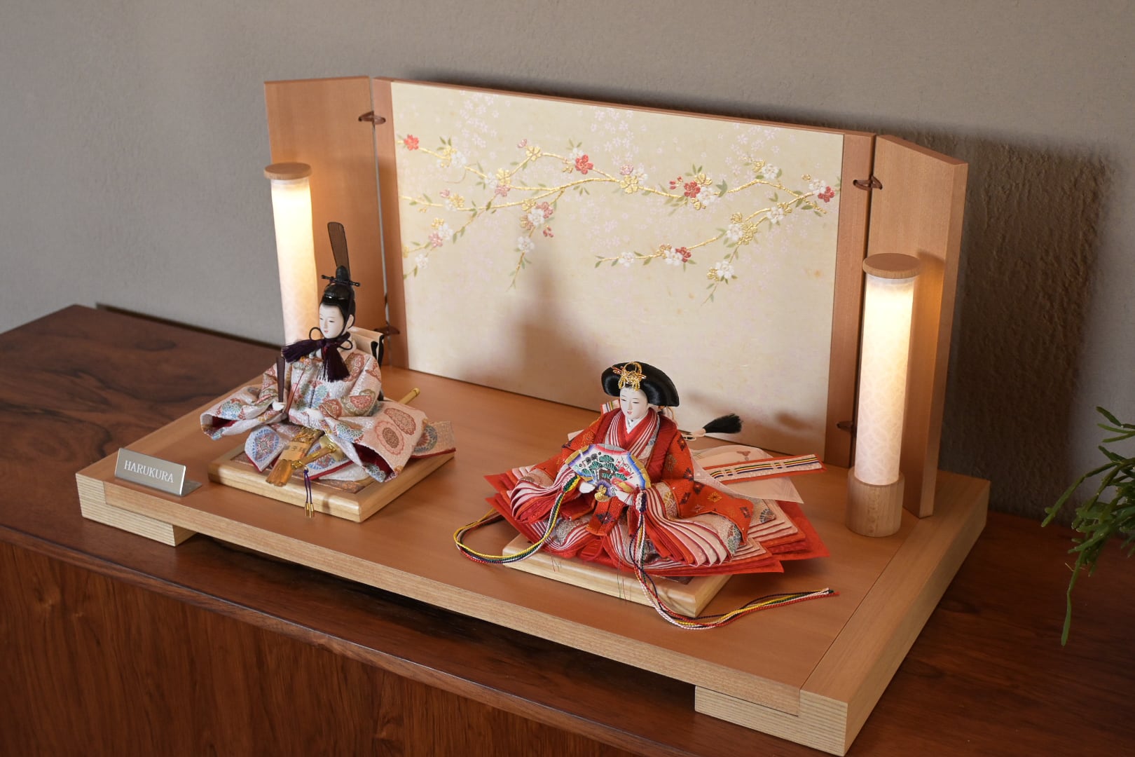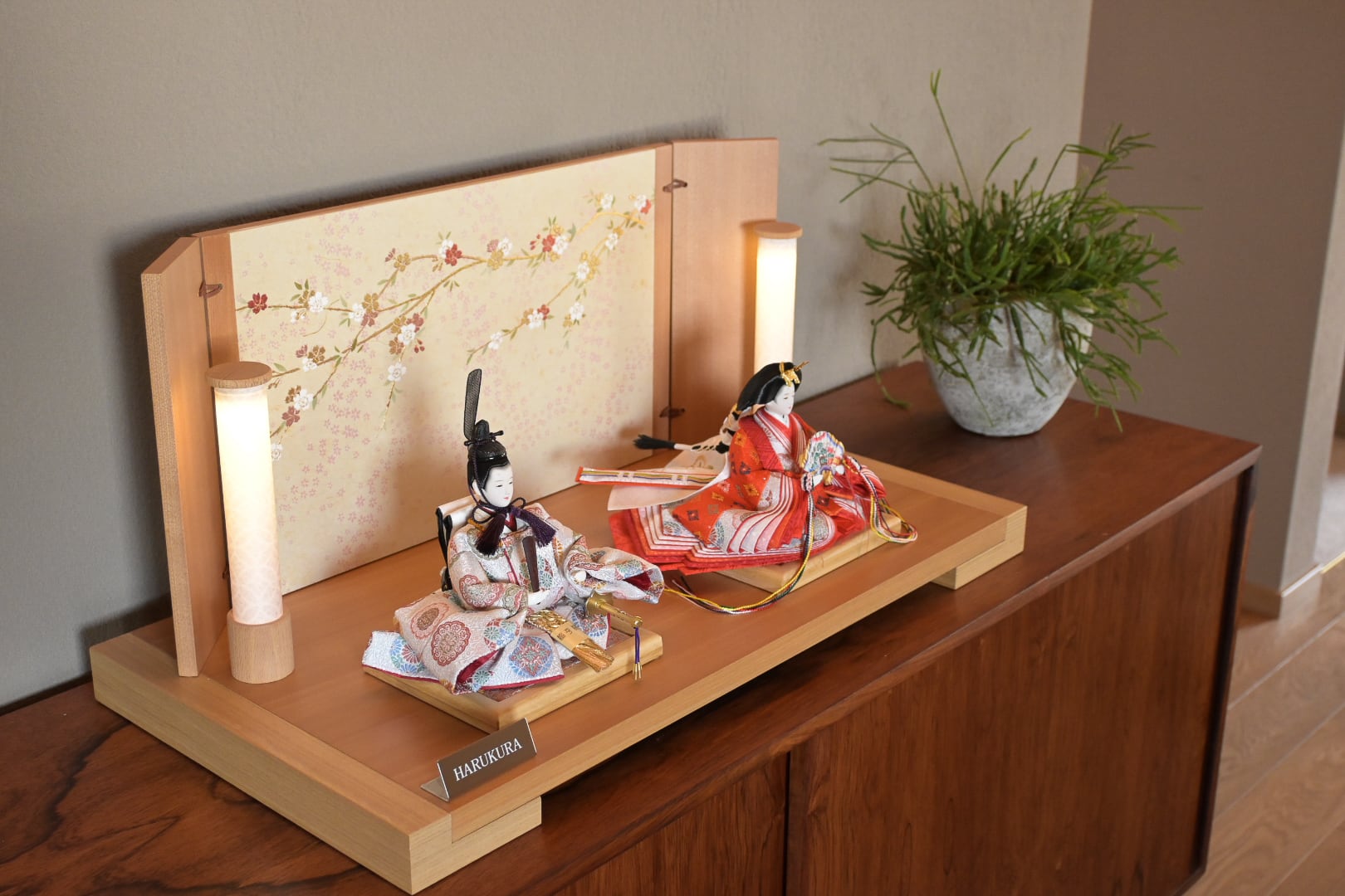 屏風の枝桜とレトロなお雛様の衣裳は相性ぴったり。